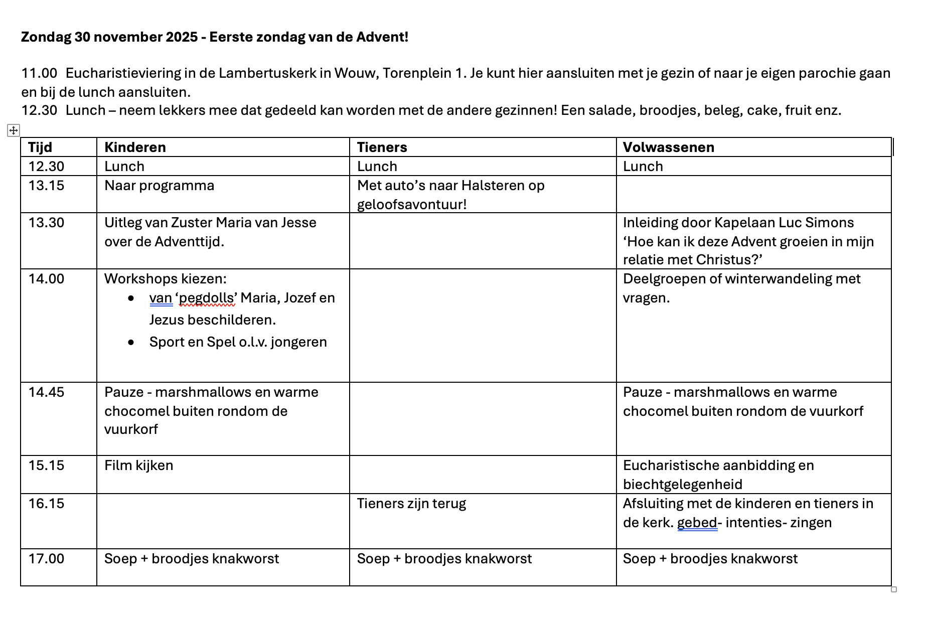 Hier vind je het programma voor de verschillende groepen. Kapelaan Luc Simons zal wat vertellen over hoe we deze Advent kunnen groeien in onze relatie met Christus. De kinderen gaan hun eigen Maria, Jozef en kindje Jezus maken en er is veel ruimte om de kerk om buiten te spelen. De tieners gaan op geloofsavontuur in Halsteren!