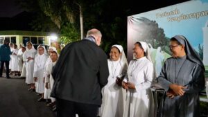 Het tweetal werd feestelijk onthaald bij de zusters franciscanessen van Charitas in Palembang. Bisschop Liesen droeg daar de heilige mis op waarin zeven zusters van Charitas hun eerste tijdelijke geloften aflegden. Het reisprogramma voert verder langs Medan, waar het Moederhuis van de zusters franciscanessen van de heilige Elisabeth is gevestigd.