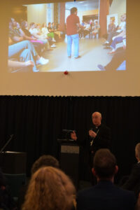 Na een indrukwekkende getuigenis van twee jongeren die recent tot de Kerk zijn toegetreden, stond bisschop Liesen stil bij de vraag hoe om te gaan met de gebouwen en ruimten van het bisdomkantoor. Deze vraag dienst zich om praktische redenen aan, maar ook als je nadenkt over hoe je een missionair bisdomkantoor wilt zijn.