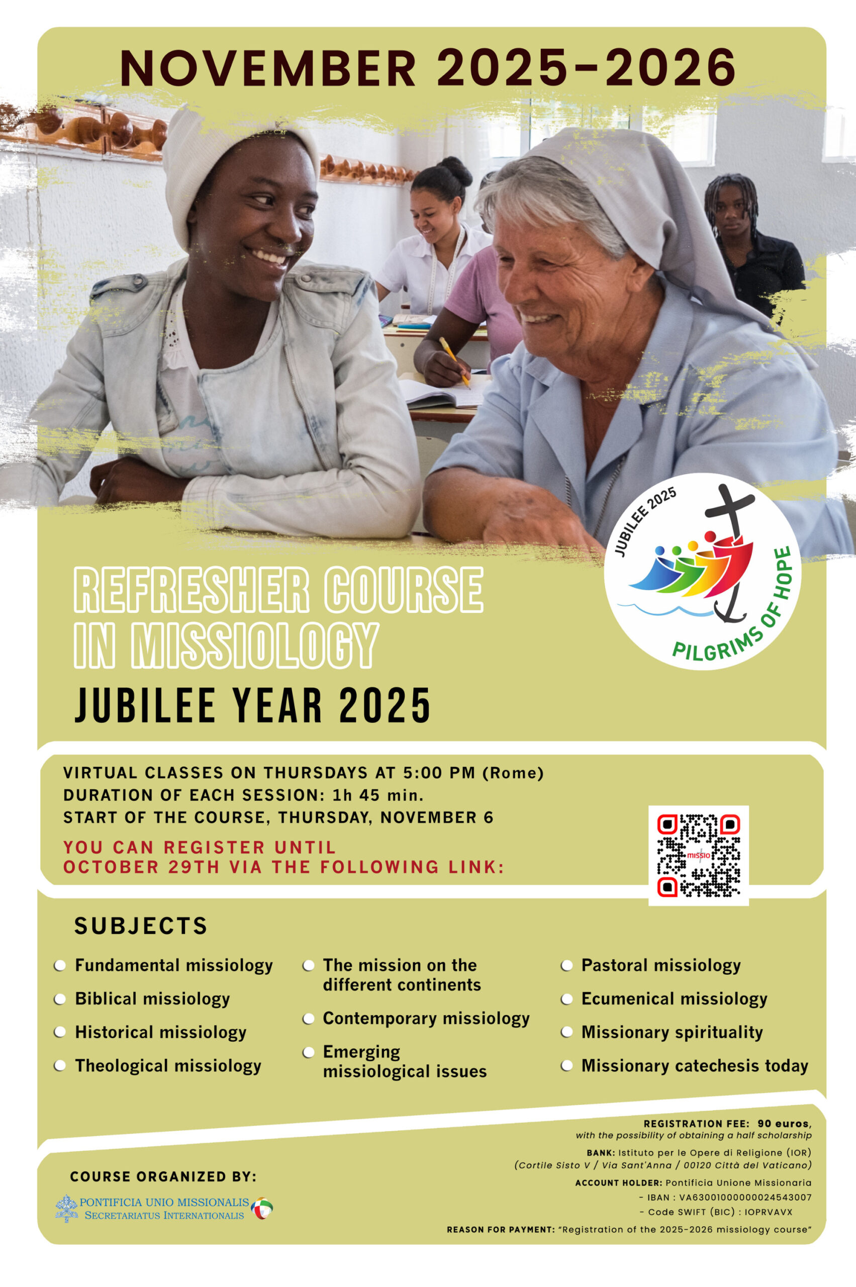 In het licht van Wereldmissiedag kunnen belangstellenden vanaf 6 november 2025 deelnemen aan een Refresher course in Missiology; een reeks Engelstalige online sessies over verschillende aspecten van Missiologie. De online cursus wordt georganiseerd door het internationale secretariaat van de Pauselijke Missionaire Unie (PMU). Het doel van deze vereniging is om mensen die werkzaam zijn in de pastorale zorg meer bewust te maken van de wereldwijde missie van de kerk. Het is een van de vier pauselijke missionaire verenigingen van de rooms-katholieke kerk.